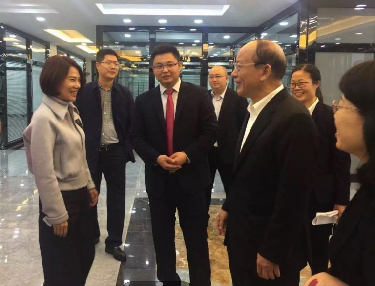珠海格力电器股份有限公司董事长兼总裁董明珠女士(左一)在东莞晟世欣兴格力贸易有限公司总经理王文先生(左三)陪同下,与信立泰药业有限公司董事长、第一产业集团董事长叶澄海先生(右二)对未来合作进行深入交谈。